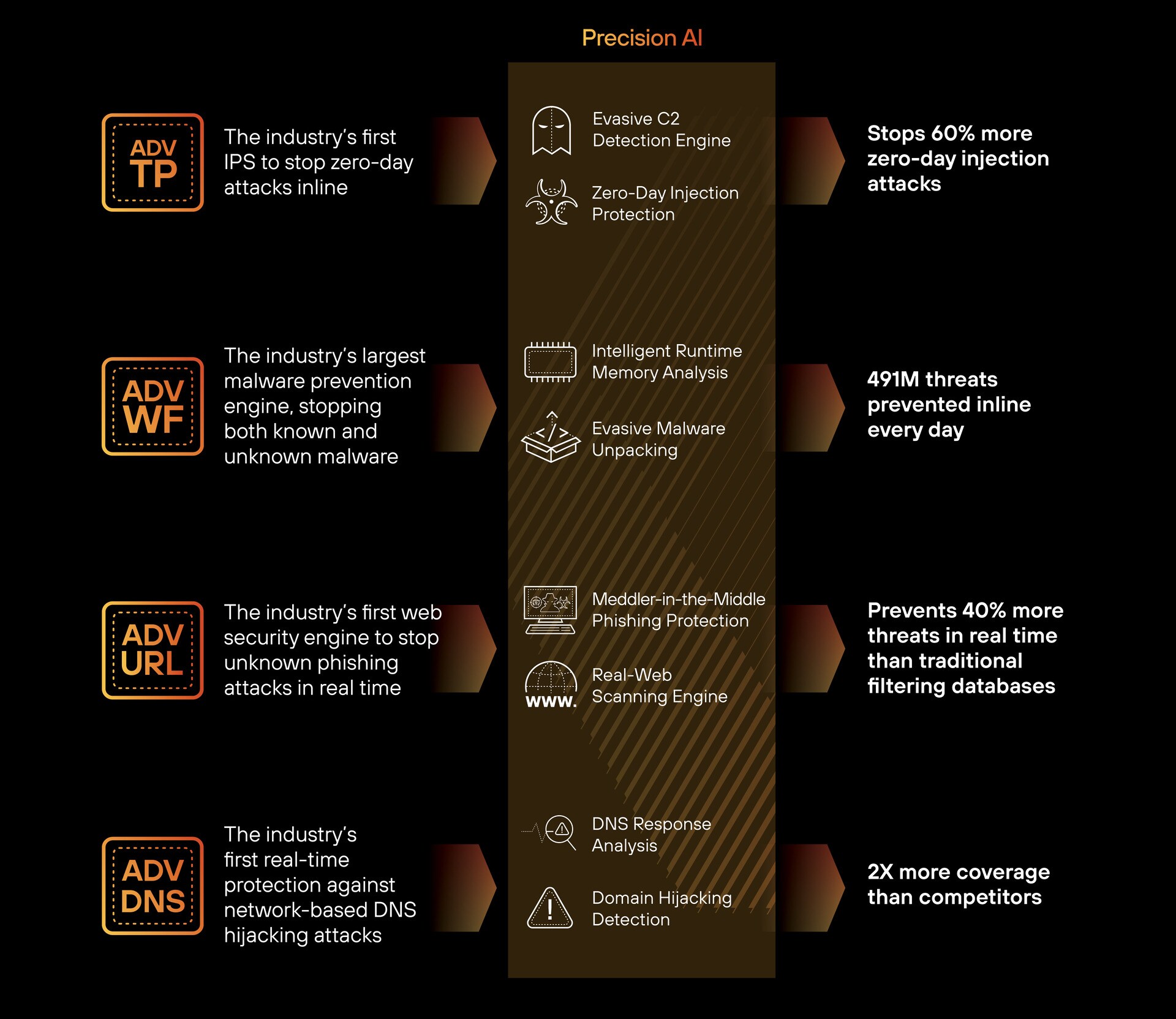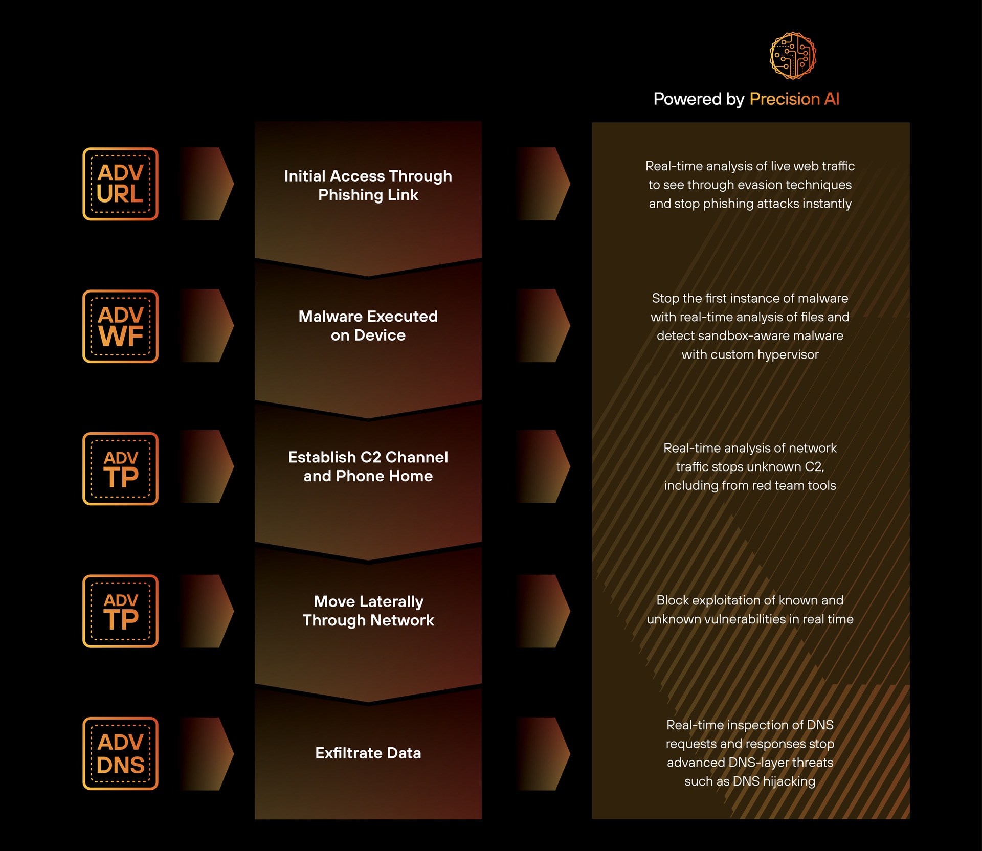 Our advanced Cloud-Delivered Security Services (CDSS)—Advanced Threat Prevention, Advanced WildFire® (AWF), Advanced DNS Security (ADNS), and Advanced URL Filtering (AURL)—are all powered by Precision AI®. This unified AI system combines the best of machine learning, deep learning, and generative AI to deliver high-fidelity, trusted outcomes for security teams. Together, these services provide proactive protection across the entire attack lifecycle, stopping known and unknown threats in real time, reducing false positives, and accelerating decision-making with confidence.