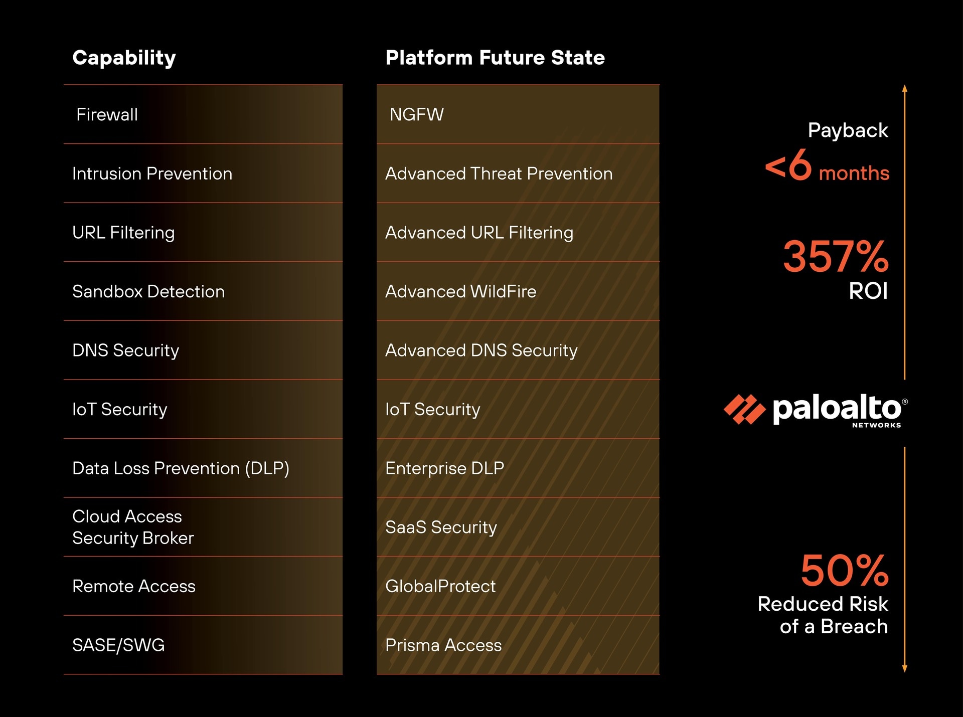 For more information, contact your local Palo Alto Networks representative to schedule a customized Security Lifecycle Review (SLR). Discover how our Cloud-Delivered Security Services (CDSS) can help prevent threats at every stage of the attack lifecycle—while delivering a 357% ROI over three years.