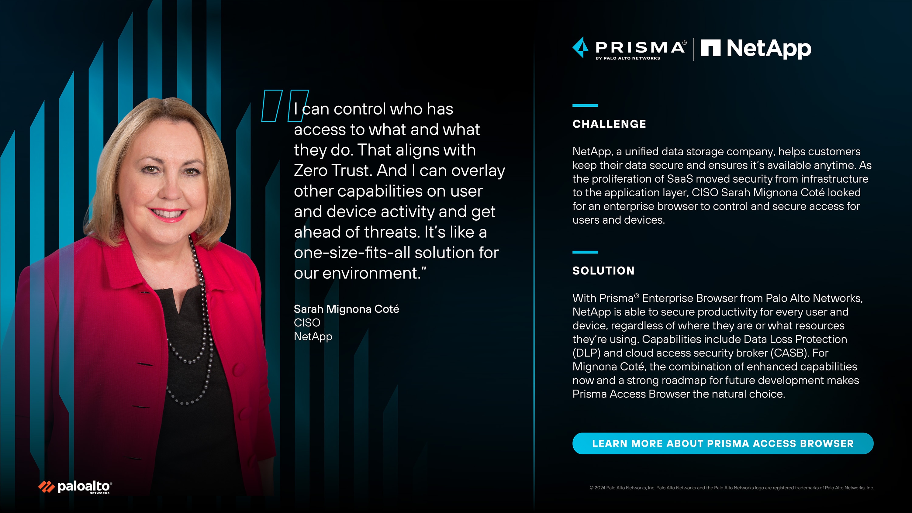 Ofer Ben-Noon, Palo Alto Networks SASE CTO sits down with Mignona Coté, NetApp Chief Security Officer, and leader in the cybersecurity industry, to discuss why Prisma Browser was the right choice for NetApp.