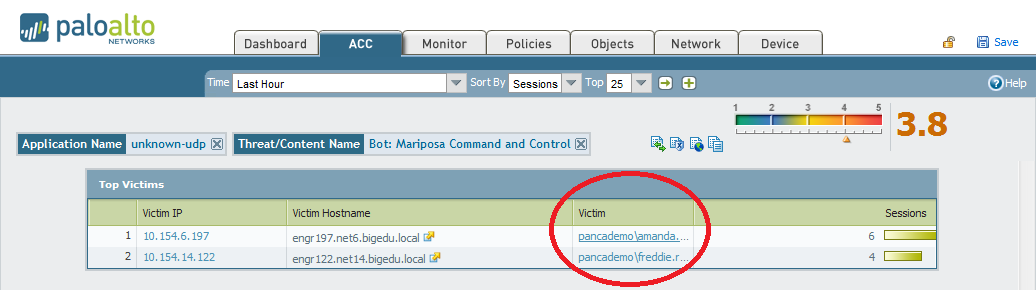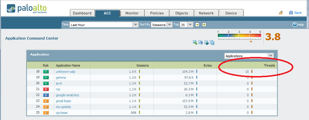 The first thing that catches the eye is the fact that the ACC shows sessions, bytes and threats on the same screen. For organizations that rely on a separate IPS for vulnerability protection, this information would not be present, nor correlated, to firewall log information. Line #18, “Unknown-UDP” is something that is unusual, because this indicates traffic that was not identified as a major well-known application. While perhaps benign, it definitely merits further investigation. Especially troubling is the fact that threats have been identified within this application traffic.