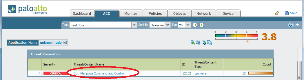 Clicking on the link for the Mariposa traffic, and Application Command and Control now filters on both “unknown-udp” and “Bot: Mariposa Command and Control”.