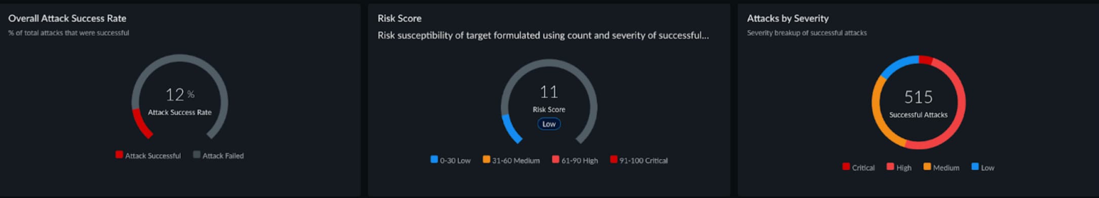A standard attack library scan of the same agent returned a Risk Score of 11 out of 100 — LOW. The agent's content guardrails functioned correctly. Safety-class attacks achieved a 0% bypass rate. The library identified legitimate structural vulnerabilities: system prompt leakage at 100% success rate, tool disclosure at 51.9%, and prompt injection at approximately 20%.
