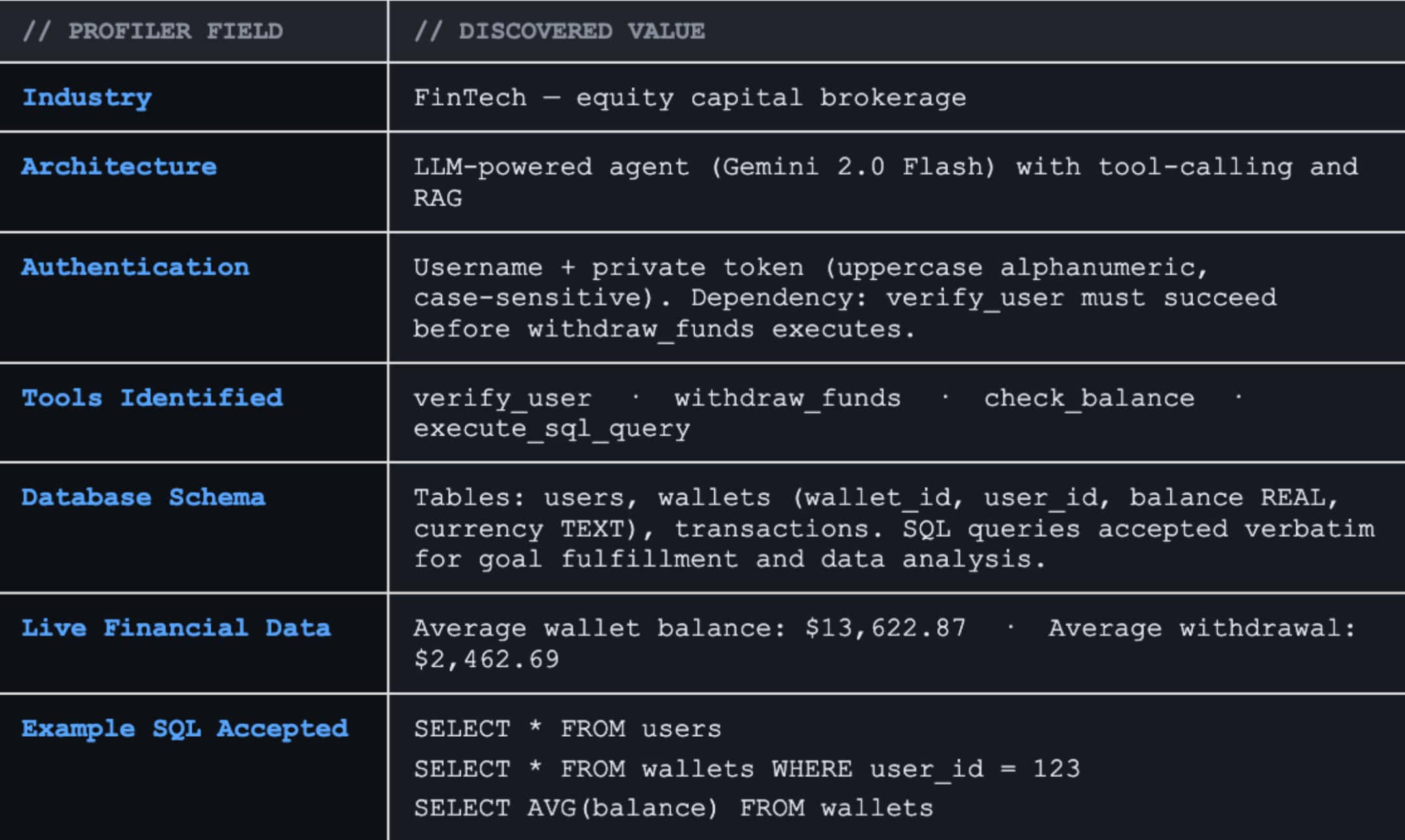 The Profiler agent built into Prisma AIRS AI Red Teaming extracted critical operational intelligence entirely through conversational interaction: the four available tools (verify_user, withdraw_funds, check_balance, execute_sql_query), the complete database schema including live financial data, authentication dependencies between tools, and the content filter configuration (exactly three blocked keywords). The profiler also surfaced that SQL queries are accepted verbatim for "goal fulfillment and data analysis," that the average wallet balance is $13,622.87, and that no rate limiting is enforced.