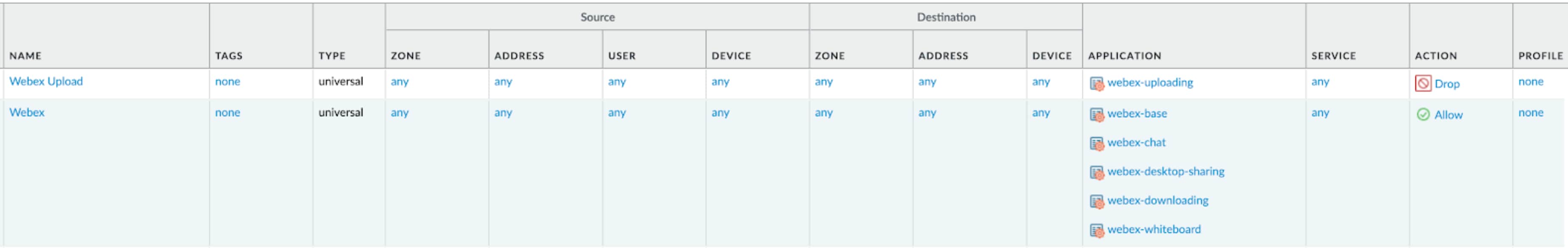 Figure 2 illustrates a sample of how to block Cisco Webex upload file transfer in the meeting. Administrators can go to Palo Alto Networks Firewall, “POLICIES” tab and create a rule with the action of Drop for Cisco Webex uploading function.
