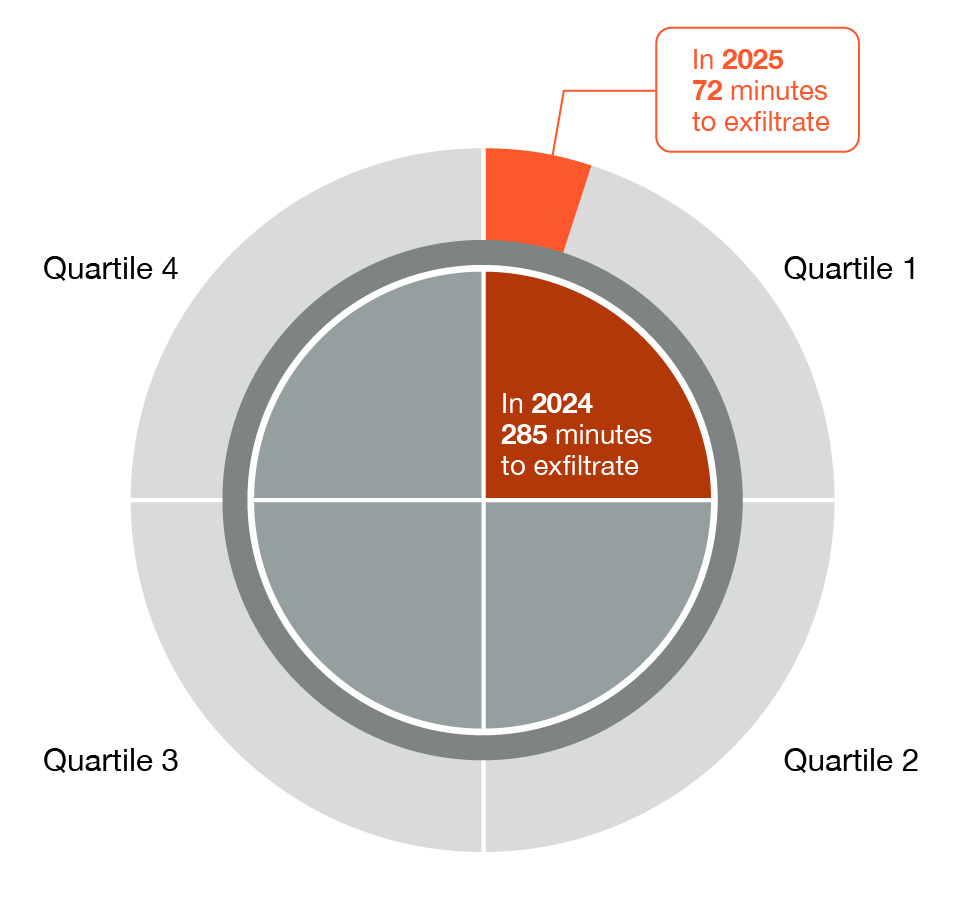 The quickest quartile of intrusions reached exfiltration in just over an hour (72 minutes) in calendar year 2025, down from nearly 5 hours (285 minutes) in 2024.