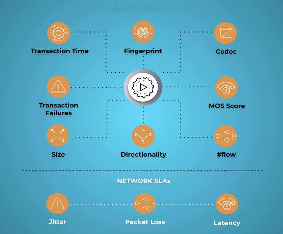 - Measure application SLAs by leveraging application traffic in real-time such as the number of transaction failures and application server response, in addition to network SLAs like jitter, packet loss and latency.