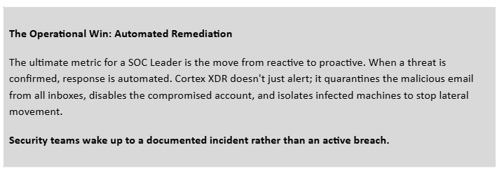 When a threat is confirmed, response is automated. Cortex doesn't just alert; it quarantines the malicious email from all inboxes, disables the compromised account, and isolates infected machines to stop lateral movement. Security teams wake up to a documented incident rather than an active breach.