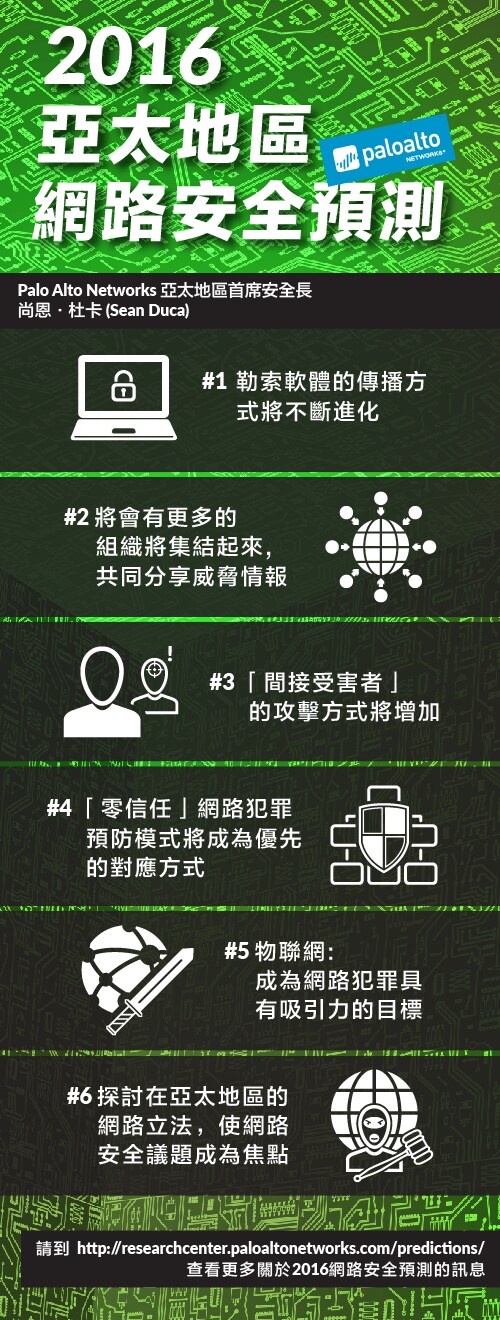 這大大有別於以「信任但需驗証」(trust but verify) 來操作的傳統安全模式,其安全能力容許政策實施和保護功能可應用於所有使用者、裝置、應用程式和 其通訊,不論用戶身在何處。我們預計這種模式將繼續在2016年在亞太區被採用。